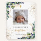 For an elegant baptism, gender neutral. A chic white background, decorated with eucalyptus greenery, faux gold glitter dust and a golden cross. Personalise and add a square sized photo on the front, the name of the child and the date of the baptism. Black and golden letters.