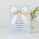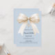 Celebrate his special day with this elegant dusty blue baptism invitation featuring a soft ivory satin bow and delicate gold cross detail.