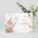 A modern and elegant baptism thank you card. A chic white background decorated with golden eucalyptus foliage. Personalise and add your photo of the child, thank you note and name. Gender neutral.