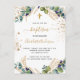 A white background decorated with eucalyptus greenery and golden leaves and faux gold glitter drops. Personalise and the childs name and ceremony details. Black and golden coloured letters.