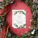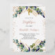 A white background decorated with eucalyptus greenery and golden leaves and faux gold glitter drops. Personalise and the child's name and ceremony details. Black and rose coloured letters. The rose gold text is written with real foil.