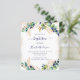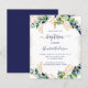 On the front: a white background decorated with eucalyptus greenery and golden leaves and faux gold glitter sparkles. A golden cross. Personalise and the child's name and ceremony details. Blue text.