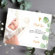 A modern and elegant baptism thank you note. A chic white background decorated with eucalyptus greenery. Personalize and add your photo of the child, thank you note and name. Gender neutral.