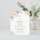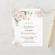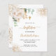 A white background decorated with eucalyptus greenery, a white rose, and golden leaves and faux gold glitter drops. Personalise and the childs name and ceremony details. Black and golden coloured letters. Gender neutral.