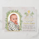 On the right side, there is text. Above the text, there is a gold foil cross, between 2 branches with green leaves. The occasion "Baptism and first birthday" and the name are written with gold foil, the rest ins mall black caps. The background is white marble.