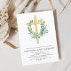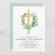 Floral Sage Green Girl's Eucalyptus and Gold Wooden Cross and Wreath Botanical Greenery Watercolor Christian Religious Baptism Invitations.