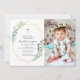 Design is composed of sans serif and playful cursive script typography on a white background filled with faux gold geometric frames and green greenery foliage leaf botanicals. A simple faux gold cross adorns the middle. Add a custom photo.