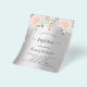 A modern, stylish and glamourous invitation for a baptism celebrating a baby girl. A faux silver metallic looking background with pink faux glitter, sparkles, and blush pink florals. The name is written with a modern hand lettered style script. Personalise and add your details.