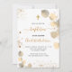 A white background decorated with golden eucalyptus and faux gold glitter dust. Personalize and the childs name and ceremony details. Black and golden colored letters. Gender neutral. Back: white background with golden faux glitter dust.