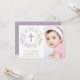 This elegant and pretty baptism, christening invitation features an illustrated floral wreath with the word "Baptism" encircling a cross. The right side of the card includes a customisable photo area. The text colour, font and message can be changed to your liking. The back of the invite features a purple background (that can be swapped to any colour of your choice) with a white quatrefoil pattern.