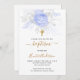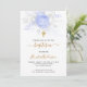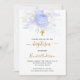 For an elegant baptism, celebrating a baby boy. A chic white background. Decorated with light blue and white florals, roses and a faux gold cross. Personalise and add the name of the child and details. Black and golden letters.
