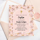 An arch frame on a pattern of pampas grass and pink flowers and a golden cross. Personalise and add a name and details.