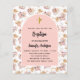 An arch frame on a pattern of pampas grass and pink flowers and a golden cross. Personalise and add a name and details.