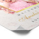 There is a baby girl photo in a faux gold foil arch, with pink orchids all around the arch. . Above it, there is a cross, also faux gold foil. Under it, the name and occasion are written in a golden calligraphic script, the welcome message and the date in small black caps. The background is white marble.