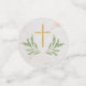 The smallest confetti have just a gold cross between 2 branches with leaves, on white marble background.