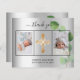 Add 2 or 3 of Your photos, vertical size, a date, name, and the thank you note. A faux silver looking background with black text and frame, a eucalyptus sprig. The text: Thank you on the front and your name on the back are written with a stylish hand lettered script with swashes.
