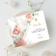 A modern and elegant baptism thank you card. A chic white background decorated with a watercolored blush pink, rose gold floral, eucalyptus greenery and faux gold leaves. Personalize and add your photo of the child, thank you note and name.