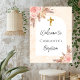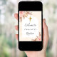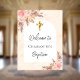 Golden marble print as background decorated with a golden cross, pampas grass and blush pink flowers and a white arched shaped frame. Personalise and add a name.