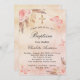 A rose gold, blush pink rustic faux metallic looking background. Decorated with rose gold and pink florals, roses, pampas grass, butterflies and a golden cross. Personalise and add a name and the details.