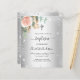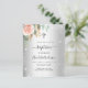 A faux silvere looking background decorated with eucalyptus greenery, a rose gold and blush pink rose, and golden leaves and faux silver sparkles. A silver cross. Personalise and the childs name and ceremony details.
