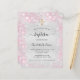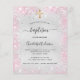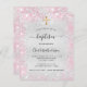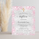 A modern, elegant baptism, celebrating a baby girl. Faux silver metallic looking background decorated with pink faux glitter dust and a golden cross. Personalise and add a name and party details. Black coloured letters.