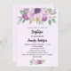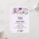 A violet, lavender watercolored background. Decorated with violet and purple watercolored flowers and greenery and a golden cross. Personalise and add a name and reception details.