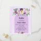 A violet, lavender watercolored background. Decorated with violet and purple watercolored flowers and a golden cross. Personalise and the name and reception details.