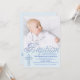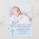 The soft blue background has the word "Baptism" written on its upper most border and hangs over your baby's photo. It is embellished with an intricate blue cross. An elegant and stylish invitation.
