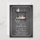 Modern Bar Cart Stock the Bar Couples Shower Invitation featuring a stylish bar cart with liquor & wine bottles & drink glasses set on a popular black chalkboard background with a matching backside.