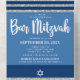 Be proud, rejoice and showcase this milestone of your favourite Bar Mitzvah! Send out this cool, unique, modern, custom all-in-one invitation for an event to remember. Bold, white script typography, Star of David and a navy blue and faux silver glitter striped tallit inspired graphic overlay a simple, cornflower blue background. This all-in-one product is an unique combination of a custom invitation with an easy to tear off perforated RSVP postcard. Personalise the custom text with your Bar Mitzvah’s name, Hebrew name, date, and venue information. Guaranteed to add stylish fun to his special occasion!