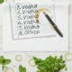 VODKA SHOPPING LIST. A humourous graphic of a shopping list with 7 bottles of vodka and just one jar of olives on it accented with a coffee cup stain and a resting pen. Cocktail Humour.