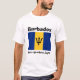 An editable title and slogan accompanies the black trident over blue and yellow bands of the Barbadian flag on the front of this t-shirt. The back displays a detailed map of Barbados.