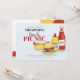 This design features a barbeque, BBQ, barbecue, or family reunion invitation, with a modern, summer, casual, picnic theme, perfect for fun outdoor parties and get-togethers, with whimsical hamburgers, hotdogs, ketchup, and mustard.