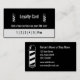 Back: A barber pole is on the left. Next to the barber pole are fields for your text, such as your name, business name, address, phone number, email, and/or website. The text is white and the background is black.
