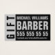 Black and grey modern gift certificate card, bold text, eye-catching, remarkable, masculine. Great for free-lance barbers starting their career.