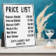 Free-standing price-list for a hairdresser or barber shop. Alter prices as you wish. Displays up to 6 items and prices. Black and white.