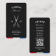 Looking for a customisable business card for your barbershop? Our Elegant Classic Modern Barber Scissors Black Silver Red Blue White Modern Barbershop design with QR code is the perfect addition to your establishment!