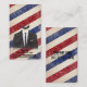 Barbershop Business card with beard , tuxedo, skinny tie graphic. Card has a grunge texture to it and traditional barber background colours. Perfect for a barber, barbershop, barber shop, or stylist.