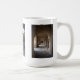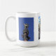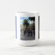 Barcelona souvenir mug, with photos of the Columbus statue, the Plaza Real, and the Montjuic Castle.