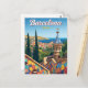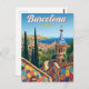 Celebrate the vibrant art and architecture of Barcelona, Spain, with this stunning vintage-style postcard. The design captures the unique, colorful mosaic walls and distinctive architecture of Park Güell (a tribute to Gaudí), overlooking the beautiful Mediterranean coastline and the red-roofed city. This travel poster is perfect for lovers of Spanish culture, Gaudi's work, and sunny European city views. Ideal for sending greetings, keeping as a colorful souvenir, or framing as sophisticated wall art.