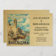 Vintage Barcelona Wedding Invitations featuring a lovely coastal church in this fetching Spanish scene. This cool mid-century retro design is the perfect way to gather guests to your Barcelona Spain destination wedding.