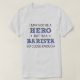 I may not be a hero, but I'm a Barista so close enough humourous word art in sans-serif and doodle cross-hatch font lettering in black and dark royal blue with two distressed accent stars.