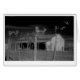 Black and white infrared photograph of deer antlers and barn on Texas ranch.
