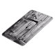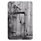 "Barn Door with Tree" magnet is a rustic image of the worn, weathered wood of a latched barn door with a tree growing against the outside wall of boards. Done in black and white.