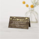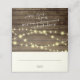 Rustic barn wood and string lights folded seating card with white area for hand writing names and table number and personalised names and message on reverse side.