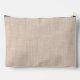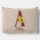 Stylish personalised cosmetic bag features decorated rustic red barn wood letter / initial A with sunflower bouquet embellishment on a beige burlap background.