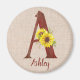 Stylish magnet features decorated rustic red barn wood letter / initial A has with sunflower bouquet embellishment on a beige burlap background.