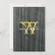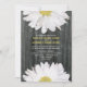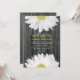 A simple wedding invitation featuring daisies peeking out from top and bottom. Background is barnwood. Customise the matching text at centre with details of your wedding. Opposite side features matching barnwood background. Personalise with the names of the bride and groom over monogram. Recycled paper. Wording is from bride & groom together with their parents.