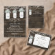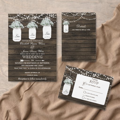 Rustic Barnwood, dangling string lights with baby's breath in a mason jar wedding invites. Matching products also available.
