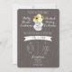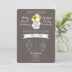 A wedding invitation featuring an illustration of a mason jar filled with daisies and black eyed susans between bride's and groom's names. Text and designs are white, background is barnwood inspired.
